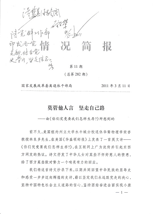 編者按:國家發(fā)改委離退休干部局《情況簡(jiǎn)報(bào)》今年第11期刊載《莫管他人言堅(jiān)走自己路——由〈你們究竟要我們?cè)鯓由??〉所想到的》,是一篇洋溢著愛國主義情懷的好詩文,現(xiàn)根據(jù)公司領(lǐng)導(dǎo)的指示予以轉(zhuǎn)載,請(qǐng)各支部作為黨史學(xué)習(xí)的生動(dòng)教材,激發(fā)全體同志堅(jiān)定永遠(yuǎn)跟著黨走的決心,堅(jiān)持走中國特色社會(huì)主義道路,為全面實(shí)現(xiàn)小康社會(huì)而努力奮斗。
