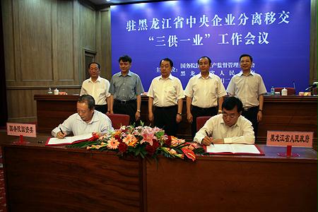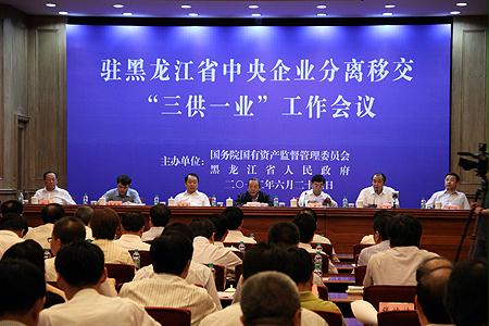 為推進中央企業(yè)分離辦社會職能,做好駐黑央企分離移交“三供一業(yè)”(供水、供電、供熱和物業(yè)管理)工作,6月28日上午,國務院國資委與黑龍江省人民政府在哈爾濱共同召開駐黑龍江省中央企業(yè)分離移交“三供一業(yè)”工作會議。國務院國資委副主任、黨委副書記邵寧和黑龍江省人民政府副省長張建星出席會議并講話。黑龍江省政協(xié)黨組副書記、省國資委黨委書記趙克非和國務院國資委副秘書長郭建新出席了會議。會議由黑龍江省人民政府省長助理、省國資委主任趙杰主持。會上,哈爾濱市政府介紹了分離移交“三供一業(yè)”有關政策及經(jīng)驗;哈電集團、中航工業(yè)東安公司、兵器工業(yè)集團、國家電網(wǎng)代表有關中央企業(yè)作了發(fā)言;國務院國資委與黑龍江省人民政府簽署了《關于駐黑龍江省中央企業(yè)分離移交“三供一業(yè)”工作協(xié)議》,有關企業(yè)與接收單位簽訂了《分離移交協(xié)議》。