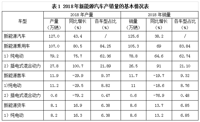 圖1 中國汽車銷量及增長率 據(jù)中國汽車工業(yè)協(xié)會數(shù)據(jù)顯示:2016年,我國自主品牌乘用車的銷售量同比增長20.5%,占全部乘用車銷售量的43.2%,比上年同期提高2個百分點。2017年產(chǎn)銷量中,自主品牌乘用車銷售量達1084.7萬輛,同比增長3%,占乘用車銷售總量的43.9%,比上年同期提高了0.7個百分點。2018年,中國品牌乘用車共銷售998.0萬輛,同比下降8.0%,占乘用車銷售總量的42.1%,占有率比上年同期下降1.8%。 傳統(tǒng)汽車工業(yè)的發(fā)展,使人們出行更加方便,生活方式和生活節(jié)奏逐漸加快,但同時,環(huán)境污染問題日益嚴(yán)重,能源問題也逐漸顯現(xiàn)。大力發(fā)展新能源汽車是國際社會為解決能源、環(huán)境和氣候問題采取的共同方案,也是國際汽車工業(yè)領(lǐng)域新一輪的競爭焦點。 對于中國汽車產(chǎn)業(yè)來說,推廣新能源汽車發(fā)展有助于逐步推進節(jié)能減排,推出新的國家經(jīng)濟增長點,以及實現(xiàn)相關(guān)產(chǎn)業(yè)與企業(yè)由大到強的轉(zhuǎn)變,同時也是拉近與世界汽車強國距離的一次發(fā)展機遇。中國政府一直高度重視新能源汽車的發(fā)展,在政府的大力支持下,我國相關(guān)產(chǎn)品技術(shù)穩(wěn)步提升,人們可選擇的種類及品牌逐漸增多,基礎(chǔ)設(shè)施及設(shè)備建設(shè)不斷完善,預(yù)測未來我國新能源汽車銷量將繼續(xù)保持較高速增長。 2018年我國新能源汽車產(chǎn)銷量如表1所示,全年累計產(chǎn)量為127萬輛、年銷量為125.6萬輛,占全部汽車銷量的4.5%,比2017年同期增長61.7%。其中,新能源乘用車全年累計銷售量為105.3萬輛,純電動車占據(jù)了約75%的份額;新能源客車和貨車的銷售量幾乎全部來自于純電動車。