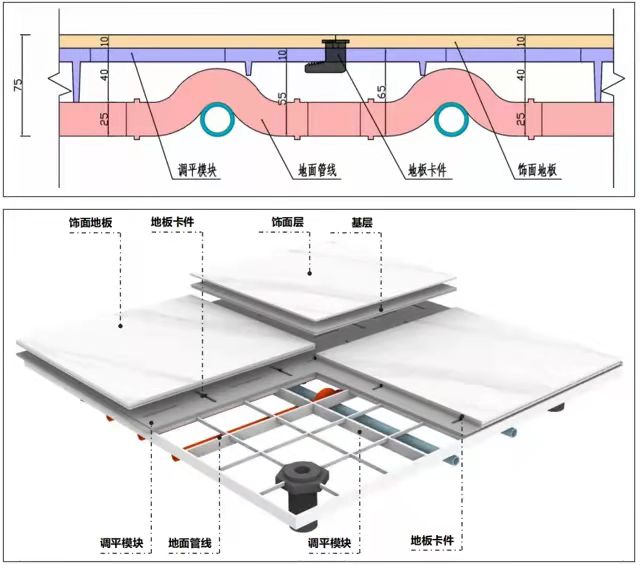由調(diào)節(jié)支腳和架空格柵組成的調(diào)平模塊空腔中不僅可以敷設(shè)管線,而且縮短了架空高度,節(jié)省了室內(nèi)空間,實現(xiàn)管線分離;飾面地板模塊單獨可拆卸,實現(xiàn)設(shè)備和管線的可視化,便于后期設(shè)備和管線的檢修及更換,參見下圖。若選用地暖采暖,干法樓面可以組合采暖模塊,在架空格柵上直接安裝地暖模塊,并可直接敷設(shè)飾面地板,導(dǎo)熱快速。