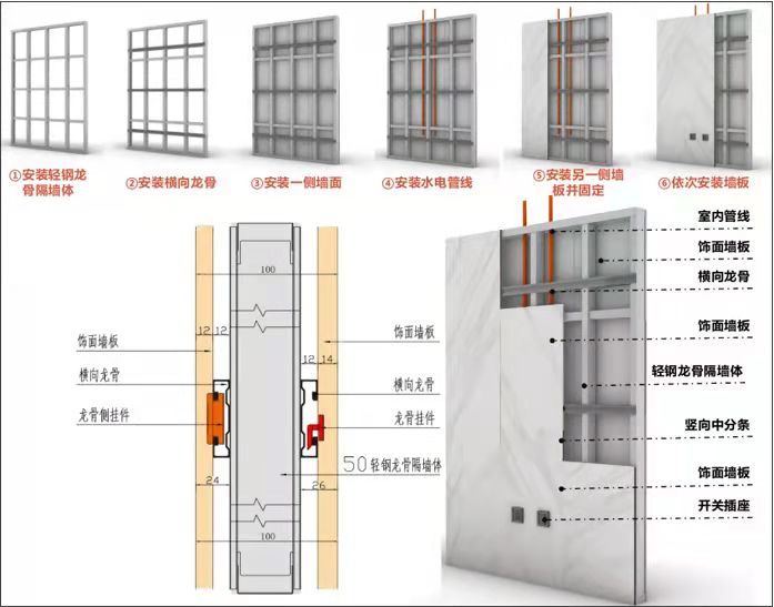 實施方法以輕鋼龍骨內(nèi)墻隔板為例,整個內(nèi)隔墻體系由輕鋼龍骨隔墻體,橫向龍骨,飾面材料組成,敷設(shè)管線時,可在輕鋼龍骨隔墻體空腔中安排布置,不受傳統(tǒng)點位布置的局限。