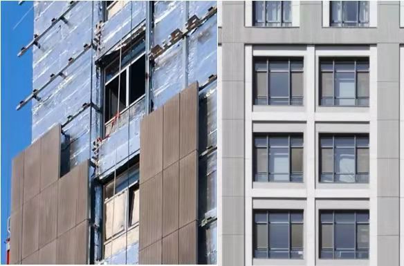 通過技術(shù)的不斷發(fā)展和革新,同一種外墻掛板材質(zhì),也可以通過自身機(jī)理和顏色的不同打造豐富而有質(zhì)感的立面效果。ECP板按照表現(xiàn)加工工藝分為清水飾面板、表面涂裝板和基層板材。寬度規(guī)格為500~600mm,生產(chǎn)長度規(guī)格為5m。ECP裝配式外墻安裝構(gòu)造,內(nèi)墻是ALC墻板,外做巖棉保溫,覆防水透氣膜,空氣層外掛ECP板。面板可以制成不同的肌理效果,并且飾面顏色選擇多樣化。