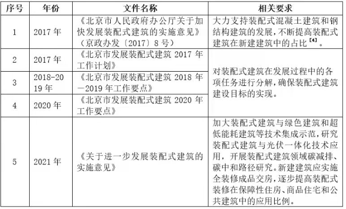 2021年上半年,全國各地裝配式建筑發(fā)展目標(biāo)及扶持政策匯總共有100余條。以北京市為例,自2017年以來,逐年發(fā)布各類發(fā)展裝配式建筑的相關(guān)政策文件,大力支持發(fā)展并不斷提高裝配式建筑在新建建筑中的占比。相關(guān)政策文件如下[3]: