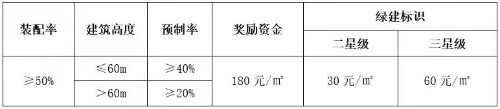 注:單項目獎勵金額最高不超2500萬元。已享受獎勵的裝配式項目,另外取得綠建二星級、三星級標(biāo)識的,增加獎勵金額。達(dá)到相對應(yīng)的綠建星級后,單項目再獎勵金額最高不超500萬元。