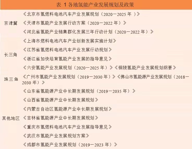 《能源發(fā)展戰(zhàn)略行動計劃(2014— 2020年)》(國辦發(fā)〔2014〕31號)明確將“氫能與燃料電池”作為能源科技創(chuàng)新戰(zhàn)略方向。財政部、科技部、工業(yè)和信息化部、國家發(fā)展改革委聯(lián)合發(fā)布的《關(guān)于2016— 2020年新能源汽車推廣應(yīng)用財政支持政策的通知》(財建〔2015〕134號),對于燃料電池汽車的財政補貼提高至20萬元/輛,并提出2017— 2020年除燃料電池汽車外,其他車型補助標(biāo)準(zhǔn)適當(dāng)退坡?!赌茉醇夹g(shù)革命創(chuàng)新行動計劃2016— 2030年》《“十三五”國家戰(zhàn)略性新興產(chǎn)業(yè)發(fā)展規(guī)劃》和《“十三五”國家科技創(chuàng)新規(guī)劃》等國家級規(guī)劃,都將氫能發(fā)展與燃料電池技術(shù)創(chuàng)新提升到國家戰(zhàn)略高度,列為重點發(fā)展方向。地方政府和企業(yè)積極探索氫能產(chǎn)業(yè)發(fā)展,出臺了不少支持政策,初步形成制備、儲運、應(yīng)用等環(huán)節(jié)的完整產(chǎn)業(yè)鏈(見表1)。氫能產(chǎn)業(yè)布局由珠三角、長三角、京津冀等先發(fā)區(qū)逐步向環(huán)渤海、大中原、華北、西北及東北區(qū)域擴展。