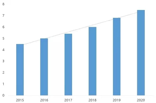 隨著社會經(jīng)濟(jì)的不斷發(fā)展,高耗能行業(yè)必須有與之匹配的節(jié)能機(jī)制。我國節(jié)能環(huán)保產(chǎn)業(yè)產(chǎn)值,已由2015年的4.5萬億元,上升到2020年的7.5萬億元左右,并呈持續(xù)增長態(tài)勢(見圖3)。