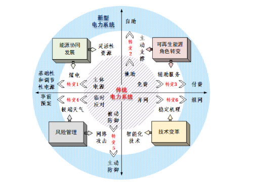 總的來(lái)看,2030年之前,由于可再生能源比例相對(duì)較低,且煤電等電網(wǎng)友好型電源還發(fā)揮著基石作用,電力系統(tǒng)安全穩(wěn)定運(yùn)行的風(fēng)險(xiǎn)相對(duì)可控。2030年之后,隨著碳中和進(jìn)程加快,可再生能源占比持續(xù)上升,與此相關(guān)的風(fēng)險(xiǎn)和挑戰(zhàn)也將大幅上升。需提前做好認(rèn)識(shí)和行動(dòng)的準(zhǔn)備,堅(jiān)持居安思危、未雨綢繆、系統(tǒng)施策,做到“六個(gè)轉(zhuǎn)變”(見(jiàn)圖2),保障電力系統(tǒng)安全穩(wěn)定運(yùn)行。