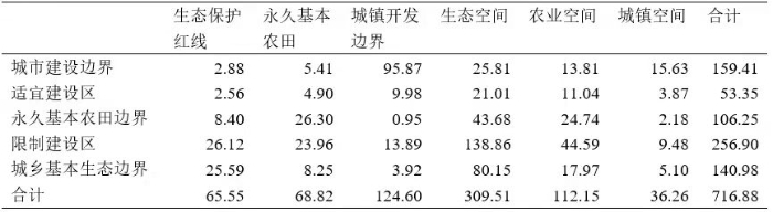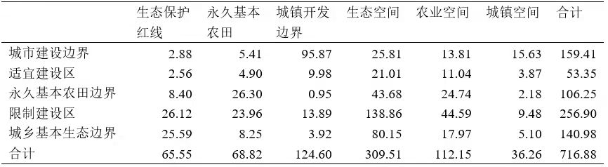 國土空間規(guī)劃的保護類用地面積顯著大于城市規(guī)劃。按照“開發(fā)—保護”的二元法劃分,城市規(guī)劃的開發(fā)類用地(城市建設邊界、適宜建設區(qū))的面積為212.76km2,保護類用地(永久基本農(nóng)田邊界、限制建設區(qū)、城鄉(xiāng)生態(tài)邊界)面積504.12km2。國土空間規(guī)劃的開發(fā)類用地(城市開發(fā)邊界、城鎮(zhèn)空間)的面積為160.86km2,保護類(永久基本農(nóng)田、農(nóng)業(yè)空間、生態(tài)保護紅線、生態(tài)空間)用地面積556.02km2。城市規(guī)劃的保護類用地面積比國土空間規(guī)劃少9.3%。在耕地保護方面,城市規(guī)劃的永久基本農(nóng)田邊界面積為106.25km2,小于國土空間規(guī)劃的永久基本農(nóng)田(68.82km2)、農(nóng)業(yè)空間面積(112.15km2)之和(合計180.97km2)。在生態(tài)保護方面,城市規(guī)劃的城鄉(xiāng)基本生態(tài)邊界(140.98 km2)、限制建設區(qū)(256.90km2)面積之和為397.88km2,與國土空間規(guī)劃的生態(tài)保護紅線(65.55km2)、生態(tài)空間(309.51km2)之和(合計375.06km2)基本持平。