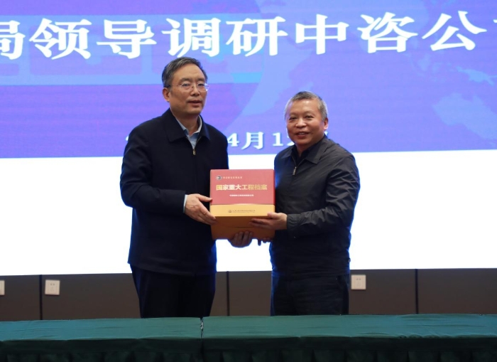 茍護(hù)生向張克儉贈(zèng)送公司編撰的《國(guó)家重大工程檔案》系列叢書(shū)。