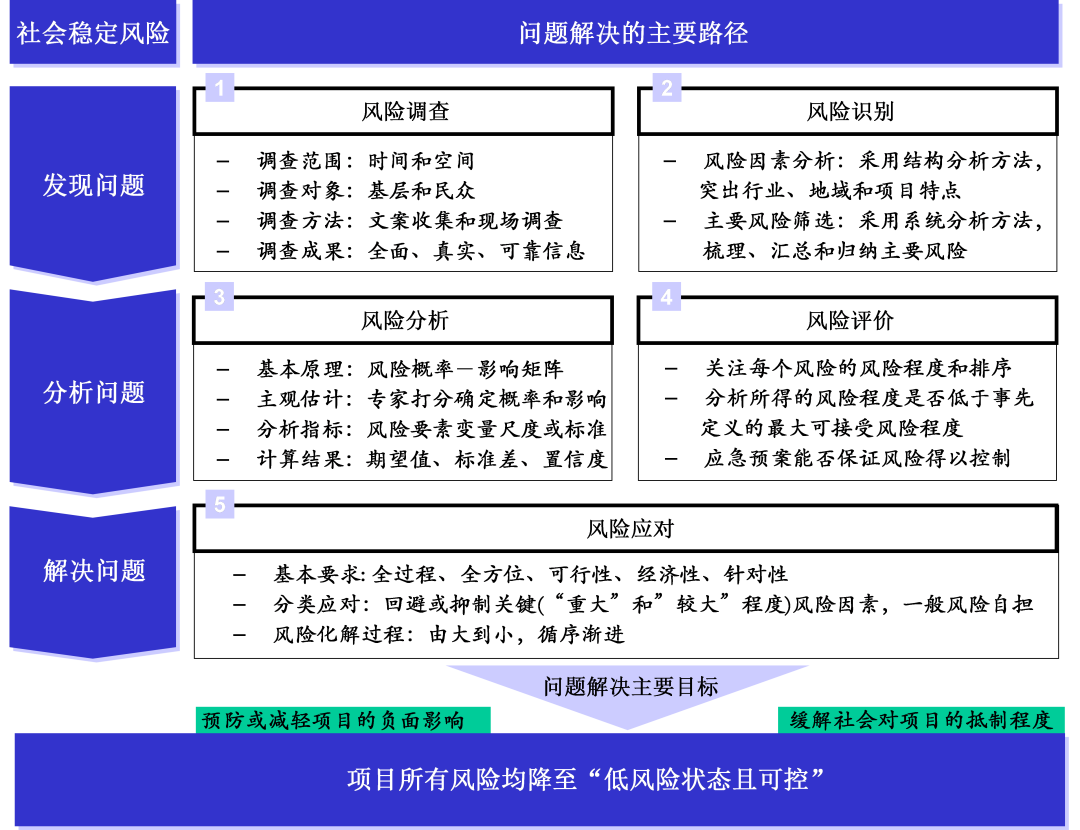 重大項(xiàng)目社會(huì)穩(wěn)定風(fēng)險(xiǎn)評(píng)估方法研究 ——“以問(wèn)題解決為導(dǎo)向”的項(xiàng)目穩(wěn)評(píng)框架的提出 李開(kāi)孟 徐成彬 彭振武 摘要:本文從社會(huì)穩(wěn)定風(fēng)險(xiǎn)及其評(píng)估的基本概念出發(fā),綜述了國(guó)內(nèi)外有關(guān)社會(huì)穩(wěn)定風(fēng)險(xiǎn)研究的理論方法和實(shí)踐探索,針對(duì)“以整體風(fēng)險(xiǎn)等級(jí)為導(dǎo)向”的穩(wěn)評(píng)框架在評(píng)估方法上存在的缺陷和不足,提出以“發(fā)現(xiàn)問(wèn)題—分析問(wèn)題—解決問(wèn)題”為主線的項(xiàng)目社會(huì)穩(wěn)定風(fēng)險(xiǎn)評(píng)估新框架?!耙詥?wèn)題解決為導(dǎo)向”的新框架思路是:通過(guò)全面深入調(diào)查,在分析各風(fēng)險(xiǎn)因素的基礎(chǔ)上確定影響社會(huì)穩(wěn)定的主要風(fēng)險(xiǎn),分析各風(fēng)險(xiǎn)的發(fā)生概率和影響程度,對(duì)標(biāo)評(píng)判風(fēng)險(xiǎn)程度及可控程度,對(duì)不可接受的風(fēng)險(xiǎn)制定切實(shí)可行的應(yīng)對(duì)措施,所有風(fēng)險(xiǎn)都處于“低風(fēng)險(xiǎn)且可控”狀態(tài)才可得出項(xiàng)目社會(huì)穩(wěn)定風(fēng)險(xiǎn)可接受的評(píng)估結(jié)論。針對(duì)“以問(wèn)題解決為導(dǎo)向”穩(wěn)評(píng)方法應(yīng)用,建議全面深入調(diào)查發(fā)現(xiàn)項(xiàng)目社會(huì)穩(wěn)定風(fēng)險(xiǎn)問(wèn)題,通過(guò)結(jié)構(gòu)分解與系統(tǒng)集成進(jìn)行風(fēng)險(xiǎn)識(shí)別,基于概率—影響矩陣的項(xiàng)目風(fēng)險(xiǎn)分析,對(duì)標(biāo)評(píng)判風(fēng)險(xiǎn)水平及其可控程度,分類制定切實(shí)可行的風(fēng)險(xiǎn)應(yīng)對(duì)措施。 關(guān)鍵詞:重大項(xiàng)目;社會(huì)穩(wěn)定風(fēng)險(xiǎn);評(píng)估方法;以問(wèn)題解決為導(dǎo)向 一、風(fēng)險(xiǎn)社會(huì)與社會(huì)穩(wěn)定風(fēng)險(xiǎn)的產(chǎn)生 經(jīng)過(guò)四十多年的改革開(kāi)放,我國(guó)經(jīng)濟(jì)社會(huì)發(fā)展成就舉世矚目。在經(jīng)濟(jì)發(fā)展水平顯著提升的同時(shí),社會(huì)問(wèn)題開(kāi)始逐步凸顯,這是社會(huì)發(fā)展的歷史階段所決定的??v觀西方工業(yè)化國(guó)家的發(fā)展歷程,都曾經(jīng)歷過(guò)類似階段,而且在一些國(guó)家的表現(xiàn)更為嚴(yán)峻和激烈,如英國(guó)工業(yè)化過(guò)程中的圈地運(yùn)動(dòng)。許多西方學(xué)者認(rèn)為,進(jìn)入現(xiàn)代化的一定階段后,必然伴隨社會(huì)風(fēng)險(xiǎn)的增長(zhǎng),并進(jìn)入風(fēng)險(xiǎn)社會(huì)的發(fā)展階段,社會(huì)風(fēng)險(xiǎn)是社會(huì)現(xiàn)代性的基本要素。 20世紀(jì)后半期,社會(huì)風(fēng)險(xiǎn)逐漸被社會(huì)學(xué)界所關(guān)注,西方許多著名社會(huì)學(xué)家如烏爾里?!へ惪耍║lrich Beck)、安東尼·吉登斯(Anthony Giddens)、尼克拉斯·盧曼(Von Niklas Luhmann)等都對(duì)社會(huì)風(fēng)險(xiǎn)進(jìn)行過(guò)深入研究,形成了有關(guān)風(fēng)險(xiǎn)的社會(huì)學(xué)理論。其基本假設(shè)是:人類正從一個(gè)現(xiàn)代化的社會(huì)進(jìn)入一個(gè)新型的風(fēng)險(xiǎn)社會(huì)。現(xiàn)代化的科學(xué)技術(shù)發(fā)展和工業(yè)化推動(dòng),使人類進(jìn)入一個(gè)它過(guò)去所陌生的世界;現(xiàn)代化邏輯本身所產(chǎn)生的新的社會(huì)風(fēng)險(xiǎn),完全不同于傳統(tǒng)的社會(huì)問(wèn)題、社會(huì)矛盾和社會(huì)沖突。過(guò)去的生活經(jīng)驗(yàn)、技術(shù)手段和組織制度,已不足以使人類防止、規(guī)避和應(yīng)對(duì)新的社會(huì)風(fēng)險(xiǎn)的威脅。進(jìn)入風(fēng)險(xiǎn)社會(huì),是社會(huì)發(fā)展的現(xiàn)代化水平達(dá)到一定階段的產(chǎn)物。德國(guó)社會(huì)學(xué)家烏爾里希·貝克認(rèn)為,現(xiàn)代性正從古典工業(yè)社會(huì)的輪廓中脫穎而出,正在形成一種嶄新的形式—工業(yè)化時(shí)代的“風(fēng)險(xiǎn)社會(huì)”。英國(guó)社會(huì)學(xué)家安東尼·吉登斯認(rèn)為,風(fēng)險(xiǎn)概念標(biāo)識(shí)了現(xiàn)代社會(huì)與前現(xiàn)代社會(huì)的根本差異。在自然和傳統(tǒng)消亡后生存的世界,其特點(diǎn)是從“外部風(fēng)險(xiǎn)”逐漸向“人造風(fēng)險(xiǎn)”轉(zhuǎn)移。 我國(guó)社會(huì)學(xué)者也認(rèn)為,隨著社會(huì)的發(fā)展,過(guò)去對(duì)社會(huì)安全問(wèn)題的認(rèn)識(shí)有了新的變化,現(xiàn)代社會(huì)開(kāi)始出現(xiàn)一種新型的社會(huì)穩(wěn)定風(fēng)險(xiǎn)。關(guān)于傳統(tǒng)社會(huì)安全,從政法工作角度分析可以歸為六種:一是“三股勢(shì)力”,暴力恐怖、宗教極端、民族分裂勢(shì)力;二是社會(huì)黑暗勢(shì)力(即黑社會(huì));三是危害社會(huì)治安的刑事慣犯;四是販毒集團(tuán);五是邪教骨干;六是各種敵對(duì)性質(zhì)的非法社團(tuán)問(wèn)題。在傳統(tǒng)的社會(huì)安全領(lǐng)域,這六個(gè)方面一直是人們關(guān)注的焦點(diǎn)。但是,隨著群體性事件的逐步增多,人們逐漸開(kāi)始意識(shí)到現(xiàn)代社會(huì)出現(xiàn)了一些新型的社會(huì)穩(wěn)定風(fēng)險(xiǎn),這些風(fēng)險(xiǎn)廣泛存在于工程建設(shè)、金融活動(dòng)、新型傳染