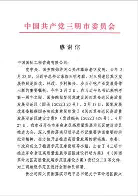 中咨公司作為咨詢服務(wù)“國家隊(duì)”,深入貫徹落實(shí)習(xí)近平總書記重要指示精神,承擔(dān)了全國革命老區(qū)振興發(fā)展的一系列咨詢服務(wù)任務(wù)。在評估工作中,中咨公司深入調(diào)研三明市特色亮點(diǎn),報(bào)送關(guān)于三明市統(tǒng)籌推進(jìn)“五位一體”總體布局和協(xié)調(diào)推進(jìn)“四個全面”戰(zhàn)略布局的調(diào)研報(bào)告。2020年公司領(lǐng)導(dǎo)牽頭,組織開展調(diào)查研究,形成上報(bào)政策研究報(bào)告,“三明實(shí)踐”被中宣部樹為重大典型。