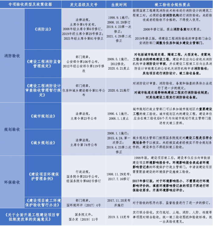 由于規(guī)劃、消防、環(huán)保等涉及到安全及公共利益,我國(guó)對(duì)這些專項(xiàng)建筑功能實(shí)施行政許可或?qū)徟?strong style="margin: 0px; padding: 0px; outline: 0px; max-width: 100%; box-sizing: border-box !important; overflow-wrap: break-word !important;">工程項(xiàng)目涉及的專項(xiàng)驗(yàn)收事項(xiàng)主要包括規(guī)劃驗(yàn)收、消防驗(yàn)收、人防驗(yàn)收、環(huán)保驗(yàn)收、節(jié)能驗(yàn)收、檔案驗(yàn)收等。本部分以消防驗(yàn)收、規(guī)劃驗(yàn)收、環(huán)境驗(yàn)收為例,簡(jiǎn)要闡述專項(xiàng)驗(yàn)收手續(xù)的歷史沿革及合規(guī)性要點(diǎn)。