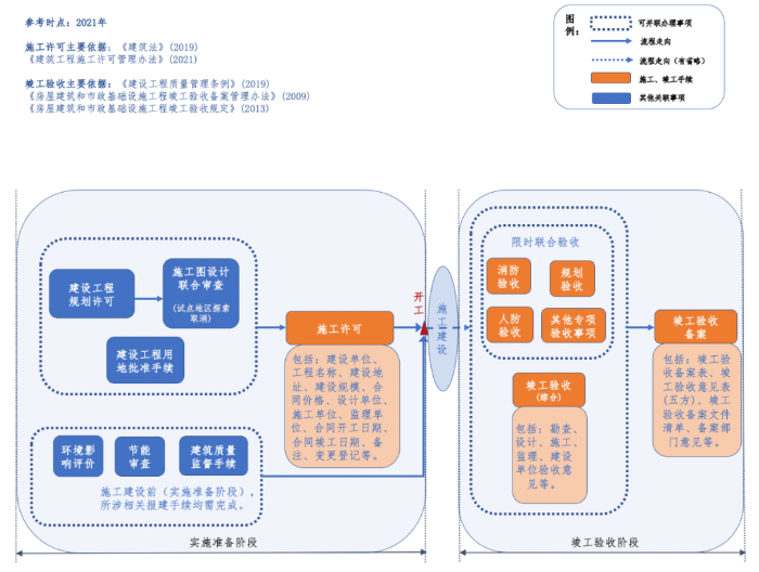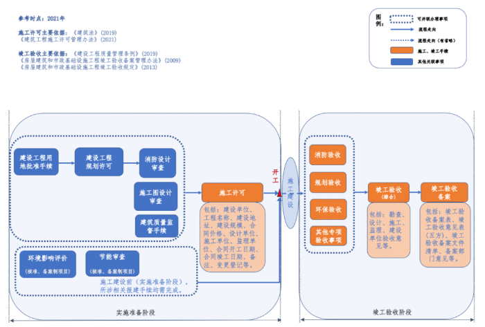 施工許可是建筑施工單位符合施工條件、允許開工的批準(zhǔn)文件,是建設(shè)單位進(jìn)行工程施工的法律憑證??⒐を?yàn)收一般包括綜合驗(yàn)收和專項(xiàng)驗(yàn)收。綜合驗(yàn)收是建設(shè)工程項(xiàng)目竣工后,全面考核建設(shè)工作,檢查是否符合設(shè)計(jì)要求和工程質(zhì)量的重要環(huán)節(jié);消防、規(guī)劃、環(huán)保等專項(xiàng)驗(yàn)收既是工程質(zhì)量的必要組份,也是行政機(jī)關(guān)對(duì)驗(yàn)收內(nèi)容的專項(xiàng)審查??⒐を?yàn)收備案是建設(shè)單位組織設(shè)計(jì)、施工、監(jiān)理等有關(guān)單位竣工驗(yàn)收合格之后,將工程建設(shè)和竣工過(guò)程中的文件報(bào)相關(guān)建設(shè)主管部門歸檔備查的重要程序,讓行政機(jī)關(guān)知悉竣工事宜。在過(guò)去二三十載,有關(guān)法規(guī)政策對(duì)以施工許可和竣工驗(yàn)收為代表的基礎(chǔ)設(shè)施項(xiàng)目建設(shè)施工方面的手續(xù)要求,整體上呈現(xiàn)較強(qiáng)的穩(wěn)定性,但也隨著法規(guī)政策演進(jìn)和機(jī)構(gòu)職能調(diào)整發(fā)生了一些變化,下文分別以2012年和2021年作為參考時(shí)點(diǎn)進(jìn)行相關(guān)手續(xù)的梳理和總結(jié)。