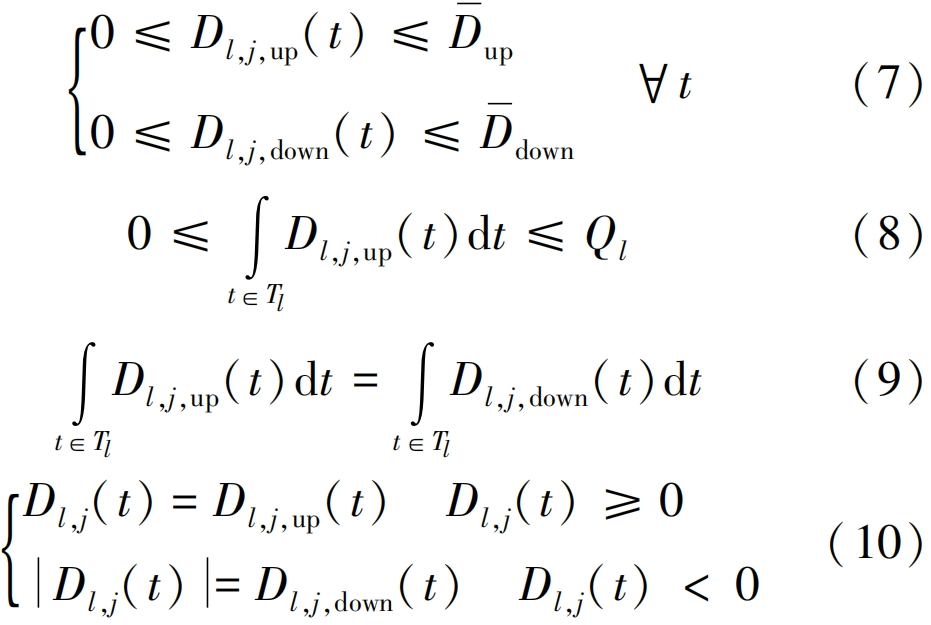 式中:image024.png分別為負(fù)荷上、下調(diào)整功率;image025.png分別為負(fù)荷上、下調(diào)整功率最大值,通常可取最大負(fù)荷的5%;image026.png為調(diào)整周期內(nèi)負(fù)荷調(diào)整電量上限;image028.png為負(fù)荷調(diào)整周期,由于負(fù)荷具有日變化周期特性,因此image028.png可取1d。