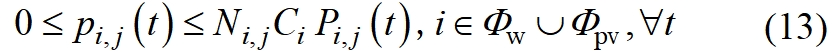 式中:image035.png為新能源出力隨機(jī)場(chǎng)景序列;image036.png為新能源機(jī)組臺(tái)數(shù);image037.png為新能源機(jī)組單機(jī)容量。水電出力功率取決于河流流量,出力約束為: