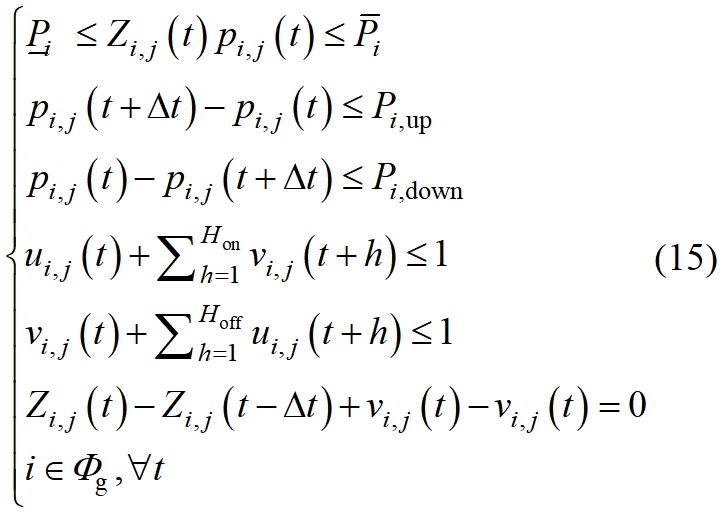 式中:image041.png分別為機(jī)組上、下爬坡率;image042.png為二進(jìn)制變量,分別表示機(jī)組啟、停機(jī)狀態(tài);image043.png表示爬坡時(shí)間間隔;image044.png為二進(jìn)制變量,表示機(jī)組運(yùn)行狀態(tài);image045.png