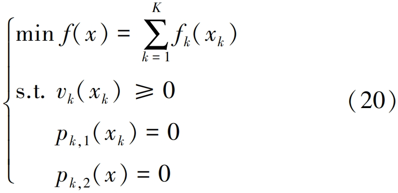 式中:image067.png為原問(wèn)題目標(biāo)函數(shù);image068.png為子問(wèn)題k的目標(biāo)函數(shù);image069.png為僅與子問(wèn)題k內(nèi)部參數(shù)相關(guān)的不等式約束;image070.png為僅與子問(wèn)題k內(nèi)部參數(shù)相關(guān)的等式約束;image071.png為各子問(wèn)題與外界耦合的復(fù)雜約束。