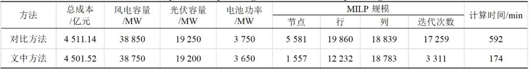 (1) 不同求解方法所得結(jié)果分析。為了驗(yàn)證所提基于區(qū)域分解協(xié)調(diào)的分層優(yōu)化方法的性能,設(shè)置了對(duì)比方法對(duì)同一規(guī)劃模型進(jìn)行求解,并對(duì)2種求解方法所得風(fēng)光儲(chǔ)聯(lián)合規(guī)劃結(jié)果進(jìn)行分析。