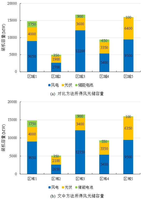 圖3 不同方法下各區(qū)域電源和儲(chǔ)能規(guī)劃容量