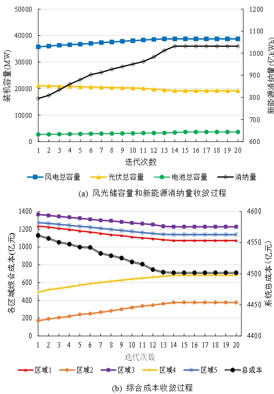 (2) 所提求解方法的收斂性分析。在求解優(yōu)化問(wèn)題時(shí),判斷一個(gè)求解方法能否得到最優(yōu)解的依據(jù)之一是其計(jì)算結(jié)果可收斂。為了驗(yàn)證文中所采用的基于區(qū)域分解協(xié)調(diào)的求解算法可以收斂到全局最優(yōu)解,對(duì)分解協(xié)調(diào)算法求解模型時(shí)的收斂過(guò)程進(jìn)行分析,圖4為迭代過(guò)程中規(guī)劃結(jié)果收斂曲線。