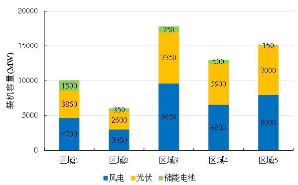 (3) 不同場(chǎng)景所得結(jié)果分析。為驗(yàn)證文中所提多區(qū)域風(fēng)光儲(chǔ)聯(lián)合規(guī)劃模型的合理性,設(shè)置對(duì)比場(chǎng)景進(jìn)行比較分析,對(duì)比場(chǎng)景中不考慮區(qū)域間聯(lián)絡(luò)線斷面約束。2個(gè)案例的規(guī)劃結(jié)果見(jiàn)表2,對(duì)比場(chǎng)景的各區(qū)域電源和儲(chǔ)能規(guī)劃容量如圖5所示,文中場(chǎng)景的各區(qū)域規(guī)劃結(jié)果如圖3(b)所示。