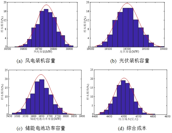 (4) 隨機(jī)因素對(duì)規(guī)劃結(jié)果的影響。新能源隨機(jī)出力對(duì)風(fēng)光儲(chǔ)聯(lián)合規(guī)劃結(jié)果具有重要影響,須在規(guī)劃模型中加以考慮。本節(jié)分別以60組隨機(jī)場(chǎng)景為輸入求解規(guī)劃模型,得到各組序列下的風(fēng)光儲(chǔ)最優(yōu)容量以及綜合成本,如圖6所示。圖中藍(lán)色柱狀圖表示60組隨機(jī)場(chǎng)景下所得結(jié)果的概率分布;紅色曲線表示概率分布的擬合結(jié)果,用來(lái)表示概率分布的形狀??梢钥闯?,所有場(chǎng)景下風(fēng)電裝機(jī)容量、光伏裝機(jī)容量、儲(chǔ)能電池功率容量以及系統(tǒng)綜合成本的收斂結(jié)果分別為38750MW、19 200MW、3650MW以及4501.52億元,所有場(chǎng)景的計(jì)算結(jié)果均服從正態(tài)分布。文中所提模型可以應(yīng)對(duì)新能源隨機(jī)出力,適用于不同隨機(jī)場(chǎng)景下的源儲(chǔ)規(guī)劃分析。