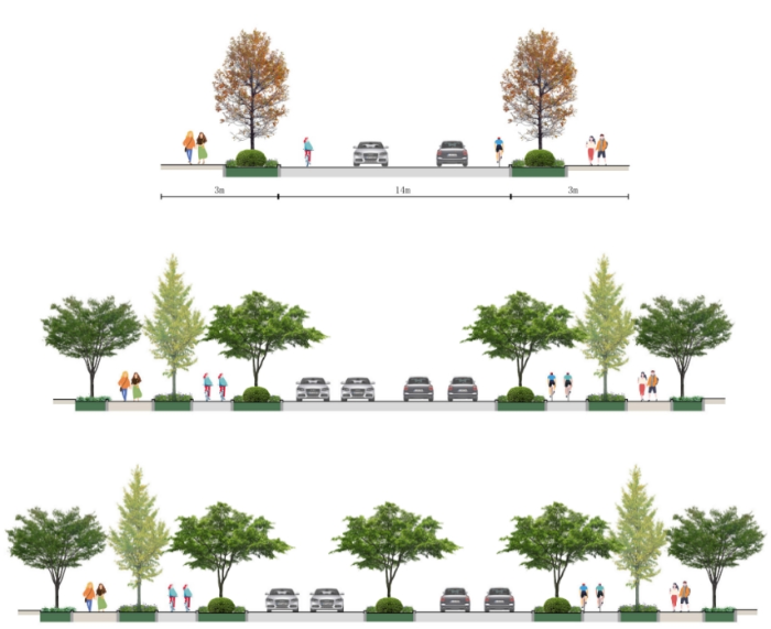林蔭道建設(shè)的主要內(nèi)容包括提升道路空間綠色服務(wù)能力,增強(qiáng)街道空間功能復(fù)合,優(yōu)化道路斷面結(jié)構(gòu),突出“綠化、彩化、珍貴化、效益化”的要求。