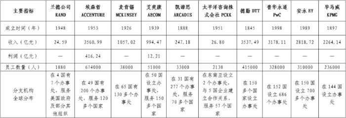 中咨公司與世界一流咨詢企業(yè)對(duì)比研究 中咨公司“青馬工程”第四小組 陳佳鵬 譚瀟 王晶晶 等 一、研究背景 (一)研究目的 黨的二十大報(bào)告提出,要“深化國(guó)資國(guó)企改革,加快國(guó)有經(jīng)濟(jì)布局優(yōu)化和結(jié)構(gòu)調(diào)整,推動(dòng)國(guó)有資本和國(guó)有企業(yè)做強(qiáng)做優(yōu)做大,提升企業(yè)核心競(jìng)爭(zhēng)力”“完善中國(guó)特色現(xiàn)代企業(yè)制度,弘揚(yáng)企業(yè)家精神,加快建設(shè)世界一流企業(yè)”,這些都為國(guó)資國(guó)企以實(shí)際行動(dòng)全面建設(shè)社會(huì)主義現(xiàn)代化國(guó)家、以中國(guó)式現(xiàn)代化推進(jìn)中華民族偉大復(fù)興提供了根本遵循。 《國(guó)企改革三年行動(dòng)方案(2020-2022年)》和《關(guān)于開(kāi)展對(duì)標(biāo)世界一流管理提升行動(dòng)的通知》(國(guó)資發(fā)改革〔2020〕39號(hào)),要求中央企業(yè)要對(duì)標(biāo)世界一流企業(yè),通過(guò)管理提升,建設(shè)成為具有全球競(jìng)爭(zhēng)力的企業(yè)。中國(guó)國(guó)際工程咨詢有限公司(以下簡(jiǎn)稱(chēng)中咨公司)“十四五”規(guī)劃明確提出,未來(lái)發(fā)展要聚焦于實(shí)現(xiàn)建成國(guó)家高端智庫(kù)和世界一流咨詢機(jī)構(gòu)的戰(zhàn)略目標(biāo),指明了公司的前進(jìn)方向。 為深入貫徹黨的二十大報(bào)告關(guān)于國(guó)資國(guó)企改革發(fā)展和黨的建設(shè)的重大部署,認(rèn)真落實(shí)國(guó)務(wù)院國(guó)資委關(guān)于中央企業(yè)對(duì)標(biāo)世界一流管理提升改革行動(dòng)計(jì)劃的相關(guān)部署和中咨公司“十四五”發(fā)展規(guī)劃,以推動(dòng)公司高質(zhì)量發(fā)展為主題,以改革創(chuàng)新為根本動(dòng)力,緊扣“加快建設(shè)世界一流咨詢機(jī)構(gòu)”目標(biāo),通過(guò)選取咨詢領(lǐng)域有較強(qiáng)影響力的標(biāo)桿企業(yè)開(kāi)展對(duì)比研究,提出中咨公司建設(shè)世界一流咨詢機(jī)構(gòu)的戰(zhàn)略構(gòu)想,進(jìn)一步搶抓高質(zhì)量發(fā)展的重要戰(zhàn)略機(jī)遇期。 (二)對(duì)比范圍 基于中咨公司業(yè)務(wù)范圍與自身戰(zhàn)略規(guī)劃,本次研究將重點(diǎn)選取全球領(lǐng)先的智庫(kù)型企業(yè)、管理咨詢企業(yè)、工程咨詢企業(yè)進(jìn)行對(duì)比研究。 表1 三類(lèi)咨詢企業(yè)分類(lèi)一覽表 (三)研究思路 重點(diǎn)圍繞經(jīng)營(yíng)規(guī)模、全球戰(zhàn)略布局、集團(tuán)化發(fā)展、數(shù)字化發(fā)展、人才培養(yǎng)等方面開(kāi)展對(duì)比研究,為中咨公司打造世界一流咨詢機(jī)構(gòu)提出初步的方向性戰(zhàn)略構(gòu)想,更好地服務(wù)公司高質(zhì)量發(fā)展總體戰(zhàn)略。充分發(fā)揮龍頭示范作用,加強(qiáng)精細(xì)化管理,全面提升核心競(jìng)爭(zhēng)力,助力中咨公司加快建設(shè)成為國(guó)內(nèi)有權(quán)威、國(guó)際有影響的國(guó)家高端智庫(kù)、世界一流咨詢機(jī)構(gòu),體現(xiàn)智庫(kù)型中央企業(yè)的使命擔(dān)當(dāng)。 二、經(jīng)營(yíng)規(guī)模現(xiàn)狀分析 (一)對(duì)比企業(yè)經(jīng)營(yíng)規(guī)模情況 1.智庫(kù)型企業(yè) 蘭德公司(RAND)是全球頂級(jí)智庫(kù)型企業(yè)之一。蘭德公司成立于1948年,總部設(shè)在美國(guó)加利福尼亞州的圣莫尼卡,是國(guó)際最知名的非營(yíng)利性的研究機(jī)構(gòu)之一,被譽(yù)為現(xiàn)代智囊的“大腦集中營(yíng)”“超級(jí)軍事學(xué)院”,致力于以嚴(yán)謹(jǐn)?shù)姆治鲅芯縼?lái)推進(jìn)決策與政策制定。擁有來(lái)自50多個(gè)國(guó)家的1880多名員工,半數(shù)以上的研究人員持有一個(gè)或多個(gè)博士學(xué)位,在2020年全球頂級(jí)智庫(kù)綜合榜單中排名第七,2021年總收入為24.59億元(折人民幣)。 業(yè)務(wù)領(lǐng)域范圍較廣。蘭德公司資金來(lái)源廣泛,目前軍隊(duì)、政府的資助仍然超過(guò)一半以上。蘭德公司主要為美國(guó)軍方、美國(guó)政府機(jī)構(gòu)、基金會(huì)、高校以及私營(yíng)企業(yè)等提供咨詢服務(wù),研究領(lǐng)域主要涉及軍事科技、國(guó)家安全、國(guó)際事務(wù)、公共安全、法律與商業(yè)、教育、健康、基礎(chǔ)設(shè)施、交通、能源、環(huán)境、網(wǎng)絡(luò)通訊、數(shù)據(jù)科學(xué)、社會(huì)公平等。 2.管理咨詢企業(yè) 埃森哲(ACCENTURE)。埃森哲成立于1953年,是一家全球領(lǐng)先的專(zhuān)業(yè)服務(wù)公司,在數(shù)字化、云計(jì)算與網(wǎng)絡(luò)安全領(lǐng)域擁有全球領(lǐng)先的能力。埃森哲秉承“科技融靈智,匠心承未來(lái)”的企業(yè)使命,致力于通過(guò)引領(lǐng)變革創(chuàng)造價(jià)值,為客戶、員工、股東、合作伙伴與整個(gè)社會(huì)創(chuàng)造美好未來(lái)。埃森哲憑借獨(dú)特的業(yè)內(nèi)經(jīng)驗(yàn)與專(zhuān)業(yè)技能,以及翹楚全球的卓越技術(shù)中心和智能運(yùn)營(yíng)中心,為客戶提供戰(zhàn)略和咨詢、互動(dòng)體驗(yàn)、技術(shù)服務(wù)和智能運(yùn)營(yíng)等全方位服務(wù),業(yè)務(wù)涵蓋40多個(gè)行業(yè),以及企業(yè)日常運(yùn)營(yíng)部門(mén)的各個(gè)職能。埃森哲是《財(cái)富》全球500強(qiáng)企業(yè)之一,在全球49個(gè)國(guó)家設(shè