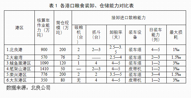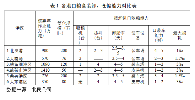 港口設(shè)施領(lǐng)先,倉儲條件優(yōu)越。北良港區(qū)總用地規(guī)模6平方公里,現(xiàn)有5萬至8萬噸級散糧裝卸專用泊位3個,通用泊位4個,糧食筒倉倉容200萬噸,年綜合通過能力1500萬噸。配備L18型散貨鐵路車3400輛,約占國內(nèi)散糧車總數(shù)近三分之一。與此同時,北良港內(nèi)的國家糧食儲備庫是中央國債投資建設(shè)的重點項目,單倉倉容3萬噸,有國內(nèi)“第一糧倉”之稱。港區(qū)運營管理經(jīng)驗豐富,中轉(zhuǎn)效率高,損耗低,筒倉存儲條件優(yōu)越,糧食接卸能力和中轉(zhuǎn)效率在遼寧沿海各港口中處于優(yōu)勢地位(見表1)。