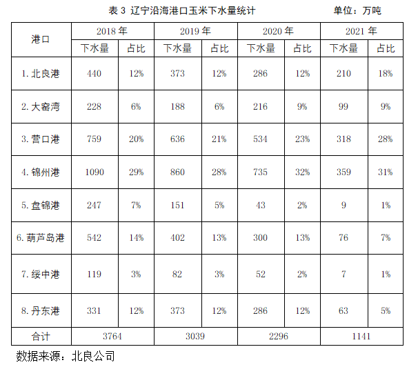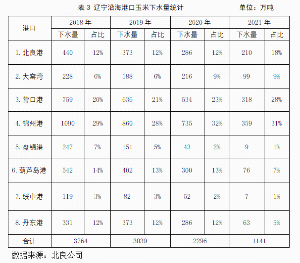 糧食流通格局發(fā)生較大變化。近年來,受到東北臨儲糧拍賣出清、“南豬北養(yǎng)”以及東北主產(chǎn)區(qū)對玉米深加工企業(yè)實施補(bǔ)貼等各方面調(diào)控政策影響,東北糧源就地消納能力極大提升,糧食外運規(guī)模顯著減少。2020年東北糧食外運量8000萬噸左右,相比2018年減少了17%。同時,東北糧食外運方式也發(fā)生了較大變化,鐵路和公路外運量占比從2018年的不到30%增至2020年近40%,鐵海聯(lián)運運輸量占比下降了10%左右,其中海鐵集裝箱聯(lián)運占比不斷提高,散船下海比例明顯下降(見表2)。受此影響,包括北良港在內(nèi)的東北各港口糧食內(nèi)貿(mào)規(guī)模呈現(xiàn)下降趨勢。2021年,遼寧港口玉米下水量約1141萬噸,同比下降了50%;北良港玉米下水量在東北主要港口中占比雖有所提升,但受大趨勢影響總體規(guī)模同比下降27%(見表3)。