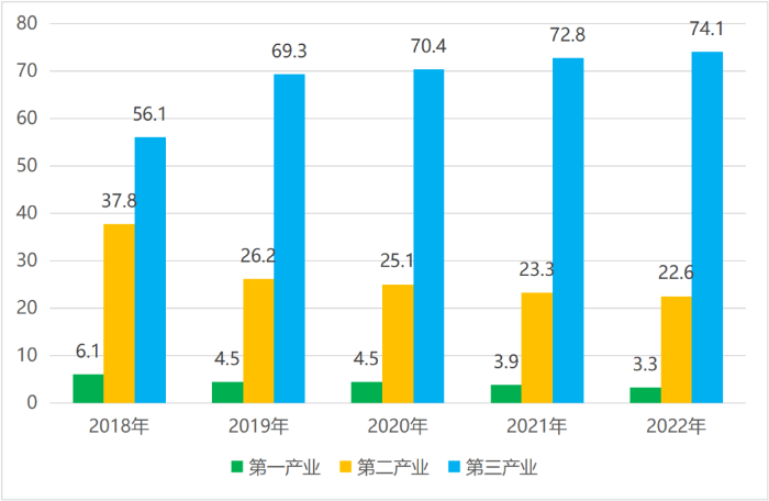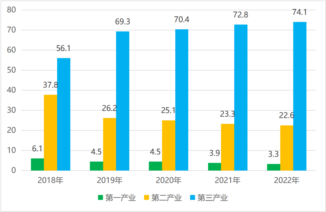 數(shù)據(jù)來源:2018年-2021年平谷區(qū)統(tǒng)計(jì)年鑒,2022年平谷區(qū)國民經(jīng)濟(jì)和社會(huì)發(fā)展統(tǒng)計(jì)公報(bào)。圖1 2018年-2022年平谷區(qū)三產(chǎn)占地區(qū)生產(chǎn)總值比重情況