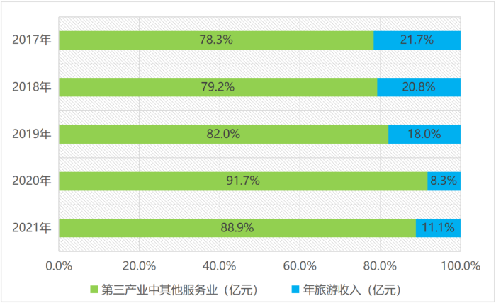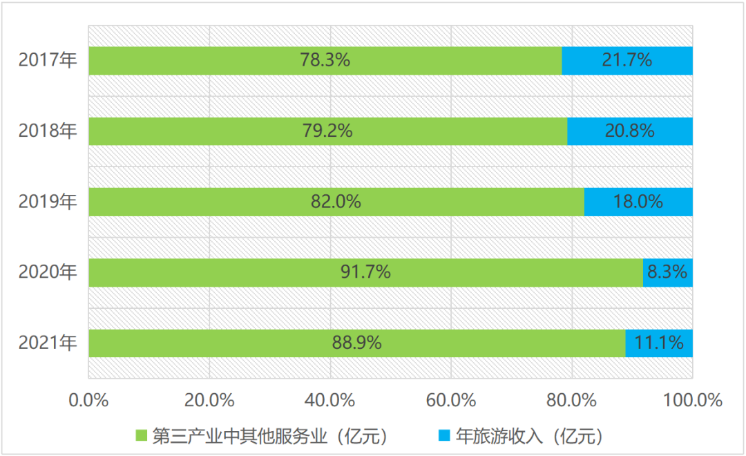 數(shù)據(jù)來源:2018年-2022年平谷區(qū)統(tǒng)計(jì)年鑒,2022年北京文化和旅游統(tǒng)計(jì)概覽。圖2 2017年-2021年平谷區(qū)旅游收入及其他服務(wù)業(yè)占第三產(chǎn)業(yè)產(chǎn)值比重情況