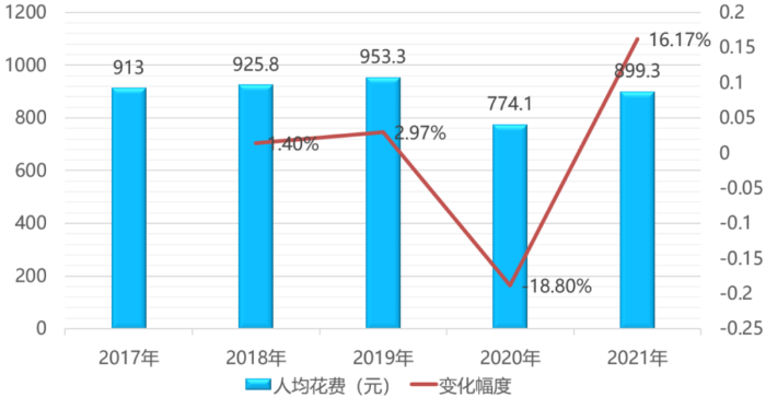 數(shù)據(jù)來源:中國旅游行業(yè)發(fā)展趨勢(shì)調(diào)研與投資前景分析報(bào)告(2022年-2029年)。圖8 2017年-2021年全國游客人均花費(fèi)情況
