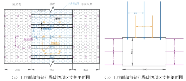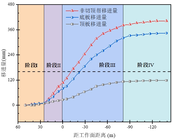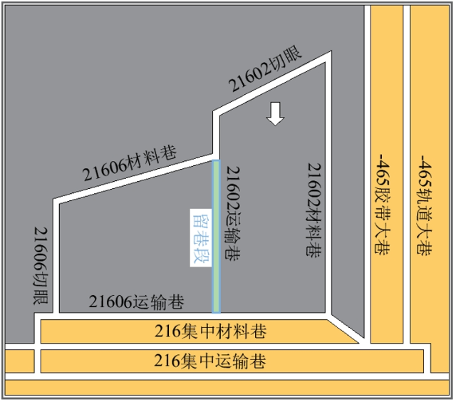 薄煤層開采沿空留巷關(guān)鍵技術(shù)研究 趙法森 吳城樂 林科文 劉飛翔 摘 要:為了確定堅硬頂板下薄煤層沿空留巷切頂鉆孔爆破參數(shù)及圍巖控制方案,以山東某礦21602工作面運輸巷為工程背景,運用理論分析、數(shù)值模擬及現(xiàn)場實測的手段進(jìn)行了研究。論文將沿空留巷劃分為三個階段,并基于計算結(jié)果給出了相應(yīng)的巷道圍巖支護(hù)方案。現(xiàn)場應(yīng)用結(jié)果表明:合理的鉆孔爆破高度為4.5m,切頂角度為70°;現(xiàn)場實施爆破后,留巷穩(wěn)定后頂板累計變形量為118mm,底板累計變形量為344mm,實體煤側(cè)累計變形量為402mm,能滿足留巷后期使用要求。相關(guān)研究成果已在21602工作面進(jìn)行了現(xiàn)場應(yīng)用,為同等條件下實施沿空留巷提供了借鑒。 關(guān)鍵詞:切頂留巷;薄煤層;堅硬頂板;巷道圍巖控制 傳統(tǒng)的留設(shè)煤柱開采方式不僅在經(jīng)濟方面不占任何優(yōu)勢,還造成大量煤炭資源浪費,由于所留設(shè)的煤柱往往出現(xiàn)應(yīng)力集中現(xiàn)象,引起巷道圍巖變形破壞,不利于巷道的維護(hù)使用[1-4]。因此,沿空留巷技術(shù)是解決上述問題的主要方式之一。沿空留巷取消了煤柱,提高了礦井的回采率[5-8],延長了礦井的服務(wù)年限,大幅度降低掘進(jìn)率,緩解采掘接替矛盾。相關(guān)數(shù)據(jù)表明,沿空留巷可提高煤炭回收率10%以上,巷道掘進(jìn)率可降低30%左右,明顯改善采掘接續(xù)關(guān)系[9-10]。切頂卸壓沿空留巷技術(shù)具有工藝簡單、性價比高、留巷速度快的優(yōu)點,尤其對堅硬頂板下沿空留巷具有明顯的優(yōu)越性[11]。 山東某礦主采平均厚度為1.35m的16#煤層,其直接頂為普氏系數(shù)大于8、平均厚度4.6m的堅硬灰?guī)r。為盡可能回收堅硬煤層下薄煤層的煤炭資源并緩解采掘接續(xù)緊張問題,采用爆破切頂沿空留巷技術(shù)來提高煤炭資源的回收率。以21602工作面運輸巷為工程背景,采用數(shù)值模擬以及現(xiàn)場監(jiān)測相結(jié)合的研究手段,確定了爆破切頂、巷道圍巖穩(wěn)定性控制等關(guān)鍵技術(shù)參數(shù)并在現(xiàn)場進(jìn)行了成功應(yīng)用。 一、工程概況 山東某礦21602工作面主采16#煤層,煤層平均厚度為1.35m,平均傾角為4°,平均埋深535m。該工作面走向長度為233m,傾斜長度為200m,采用綜合機械化開采。煤層及頂?shù)装鍘r性詳細(xì)情況見表1,直接頂和基本頂為堅硬灰?guī)r,厚度3.5-5.8m,硬度系數(shù)f=8~10。 表1 21602工作面主要圍巖情況 為緩解工作面采掘接替緊張,對21602工作面運輸巷部分區(qū)段進(jìn)行沿空留巷作業(yè),將其作為21606工作面材料巷,沿空留巷區(qū)段如圖1所示。運輸巷沿煤層頂板掘進(jìn),為半煤巖巷道,巷道斷面為矩形,凈高4m,凈寬2.6m。 圖1 工作面布置平面圖 工作面超前未切頂區(qū),巷道頂板穩(wěn)定性良好,根據(jù)工作面以往巷道實際來壓情況及支護(hù)設(shè)計[12-13],確定21602運輸巷工作面超前未切頂區(qū)巷道支護(hù)形式為“錨桿+六角菱形網(wǎng)”支護(hù)方式。其具體支護(hù)參數(shù)為:頂部錨桿為兩排螺紋錨桿,規(guī)格為φ20×2000mm,頂板錨桿間排距為:1400×1500mm;幫部錨桿為金屬螺紋錨桿,規(guī)格為φ16×1600mm,幫部錨桿間排距為:1000×1200mm,并掛六角菱形網(wǎng)支護(hù);錨桿托盤規(guī)格為:100×100×10mm。 二、21602工作面運輸巷切頂留巷關(guān)鍵技術(shù)參數(shù)確定 (一)理論分析 1.切頂高度計算 在無煤柱沿空留巷過程中,巷道圍巖的穩(wěn)定受到多種因素的綜合影響,其中切頂高度對沿空留巷的礦壓顯現(xiàn)具有非常顯著的影響[14-15]。切頂高度應(yīng)綜合考慮上覆堅硬頂板的結(jié)構(gòu)與高位巖層的破斷運移特征,保證難垮落頂板在采動應(yīng)力作用下順利沿切頂弱面切落。切頂高度的計算過程具體如下[16]: 假設(shè)切頂高度范圍內(nèi)有i層巖層,巖層編號自下向上依次為1、2、…、i,則: 式(1)可表示為: 已知: 則有: 式中,hq為切頂高度,m;H1…Hj為1…j層頂板巖層厚度(Hj為第j層頂板巖層厚度),m;M為采高,取1.35m;k1…ki 為1…i層頂板巖層碎脹系數(shù)(ki為第i層頂板巖層碎脹系數(shù));kp為加權(quán)平均碎脹系數(shù),取1.3~1.4;代入式(4),可得最合適的切頂高度應(yīng)為3.4~4.5m。 2.切頂角度分析 將切頂角度α定義為切頂與水平方向的夾角,切頂角度的大小對沿空留巷的圍巖穩(wěn)定和頂板下沉量的控制有一定的影響,切頂與水平方向角度越?。?/span> ),側(cè)向懸臂附加應(yīng)力越大,同時斷裂面下采空區(qū)的充填效果差,巷道頂板易出現(xiàn)較大旋轉(zhuǎn)變形;切頂與水平方向角度越大( ),會對爆破線附近的錨桿索產(chǎn)生擾動破壞,不利于巷道穩(wěn)定[17]。因此,最合適的切頂角度應(yīng)在70°至90°之間。 (二)數(shù)值模擬及參數(shù)選擇 1.模型構(gòu)建 本模型以21602工作面地質(zhì)生產(chǎn)條件為背景,建立沿空留巷FLAC3D數(shù)值計算模型。模型尺寸為長×寬×高=200m×140m×62.6m,模型四周約束水平位移,底部約束水平和垂直位移,頂部施加均布載荷。載荷的大小為模型頂部巖層的重量,100m深巖石自重取2.6MPa,施加均布載荷的大小為12.3MPa,模型單元采用Mohr-Coulomb本構(gòu)模型,各巖層厚度及基本物理力學(xué)參數(shù)見表2。模擬巷道開挖尺寸為200m×4m×2.6m,工作面開挖尺寸為50m×80m×1.35m,在模型中需要切