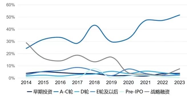 圖3 2014-2023年中國(guó)VC/PE市場(chǎng)投資各輪次案例數(shù)量比重變化