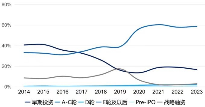 圖4 2014-2023年中國(guó)VC/PE市場(chǎng)投資各輪次交易規(guī)模比重變化