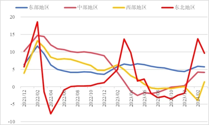 圖4  分地區(qū)固定資產投資增速(累計同比,%)
