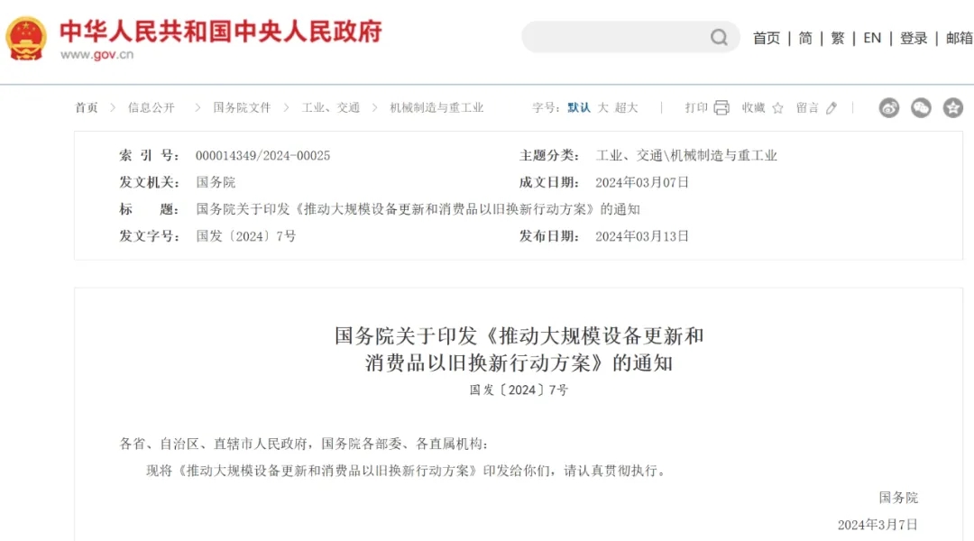 近日,國務(wù)院印發(fā)《推動大規(guī)模設(shè)備更新和消費品以舊換新行動方案》(國發(fā)〔2024〕7號,以下簡稱7號文),重點實施設(shè)備更新、消費品“以舊換新”、回收循環(huán)利用、標(biāo)準(zhǔn)提升四大行動,并明確提出加大財政政策支持力度和優(yōu)化金融支持,為大規(guī)模設(shè)備更新和消費品“以舊換新”提供堅實有效的政策保障。 習(xí)近平總書記在主持召開中央財經(jīng)委員會第四次會議時強調(diào),加快產(chǎn)品更新?lián)Q代是推動高質(zhì)量發(fā)展的重要舉措,將有力促進(jìn)投資和消費,既利當(dāng)前、更利長遠(yuǎn)。 產(chǎn)品更新?lián)Q代促進(jìn)的是有效投資, 激發(fā)的是綠色消費 當(dāng)前,我國經(jīng)濟持續(xù)回升向好的基礎(chǔ)還不穩(wěn)固,突出矛盾是有效需求不足,企業(yè)投資和居民消費的意愿不強。推動大規(guī)模設(shè)備更新,是將擴大內(nèi)需和深化供給側(cè)結(jié)構(gòu)性改革有機結(jié)合起來的具體體現(xiàn)。通過政策激勵,引導(dǎo)企業(yè)加大投資,對不符合能耗、環(huán)保、安全生產(chǎn)等最低標(biāo)準(zhǔn)的生產(chǎn)設(shè)備進(jìn)行淘汰更新,對運行效率較低的“啞設(shè)備”進(jìn)行數(shù)字化、智能化更新升級,進(jìn)一步提升技術(shù)工藝水平,為消費者提供更加優(yōu)質(zhì)、綠色、智能的產(chǎn)品,對企業(yè)來說可以提高生產(chǎn)效率和產(chǎn)品質(zhì)量,對國家來說可以拉動有效投資,為經(jīng)濟增長提供強勁支撐。 同時,近年來受諸多不利因素影響,很多家用汽車、家電、家具等大件消費品更換頻率較低,消費品更新?lián)Q代需求有提升潛力。新一輪消費品“以舊換新”,將以綠色、智能、安全消費品更新升級為重點,促進(jìn)與居民生活密切相關(guān)消費品從“有沒有”轉(zhuǎn)向“好不好”,加快淘汰符合強制報廢標(biāo)準(zhǔn)和具有安全隱患的“超期服役”產(chǎn)品,如淘汰國三以及以下排放標(biāo)準(zhǔn)或車齡15年以上的乘用車,以及超過安全使用年限標(biāo)準(zhǔn)的家電產(chǎn)品??梢哉f,這輪政策實施不僅有利于提高居民生活品質(zhì),而且將有效拓展新的綠色低碳消費空間,培育新型消費,充分激發(fā)市場對高端產(chǎn)品和服務(wù)的潛在需求。 以新質(zhì)生產(chǎn)力為引領(lǐng)助推產(chǎn)業(yè)升級 2024年1月31日,習(xí)近平總書記在中共中央政治局第十一次集體學(xué)習(xí)時強調(diào),新質(zhì)生產(chǎn)力就是創(chuàng)新起主導(dǎo)作用、擺脫傳統(tǒng)經(jīng)濟增長方式、生產(chǎn)力發(fā)展路徑,具有高科技、高質(zhì)量、高效能特征,符合新發(fā)展理念的先進(jìn)生產(chǎn)力質(zhì)態(tài)。產(chǎn)品更新?lián)Q代的實質(zhì)就是先進(jìn)替代落后,7號文提出以工業(yè)、建筑、農(nóng)業(yè)、交通、教育、文旅、醫(yī)療等七大領(lǐng)域為重點,以產(chǎn)品更新和設(shè)備升級帶動我國產(chǎn)業(yè)高端化、智能化、綠色化發(fā)展,提升安全可靠水平,為發(fā)展新質(zhì)生產(chǎn)力創(chuàng)造良好的市場環(huán)境。 據(jù)測算,我國超過20%在運的用能設(shè)備未能達(dá)到最低能耗限額標(biāo)準(zhǔn),設(shè)備更新以堅持鼓勵先進(jìn)、淘汰落后為原則,推廣應(yīng)用能效達(dá)到先進(jìn)水平和節(jié)能水平的用能設(shè)備,可以有效降低生產(chǎn)過程中的能耗和碳排放。推廣應(yīng)用智能制造設(shè)備和軟件,培育數(shù)字經(jīng)濟賦智賦能新模式,可以提高生產(chǎn)線的數(shù)字化、智能化程度,優(yōu)化工藝流程,減少人工操作失誤,提高生產(chǎn)效率和質(zhì)量,推動先進(jìn)產(chǎn)能比重持續(xù)提升。 “換新+回收”,促進(jìn)資源循環(huán)利用 大規(guī)模設(shè)備更新和消費品“以舊換新”必將帶來大量老舊設(shè)備和產(chǎn)品的回收循環(huán)利用問題,對“退役”設(shè)備和各類廢棄產(chǎn)品進(jìn)行妥善處置和循環(huán)利用是大規(guī)模設(shè)備更新和消費品“以舊換新”順利實施的重要保障。7號文將回收循環(huán)利用行動作為四大行動之一,推行“換新+回收”模式,對于促進(jìn)資源循環(huán)利用、提高經(jīng)濟循環(huán)質(zhì)量和水平具有重要意義。 實施好回收循環(huán)利用行動,關(guān)鍵要堅持產(chǎn)品全生命周期理念,形成產(chǎn)品從設(shè)計研發(fā)到回收利用的良性循環(huán)。要大力推行產(chǎn)品和設(shè)備的生態(tài)設(shè)計,使廢舊產(chǎn)品和設(shè)備易拆解、易回收。要加快完善廢舊產(chǎn)品和設(shè)備回收體系,積極構(gòu)建“換新+回收”新模式,引導(dǎo)二手車和二手電子產(chǎn)品市場便利化、規(guī)范化發(fā)展,促進(jìn)汽車零部件、工程機械、機床等廢舊生產(chǎn)設(shè)備再制造,鼓勵風(fēng)電光伏、動力電池等產(chǎn)品設(shè)備及關(guān)鍵部件梯次利用,有效提高廢舊產(chǎn)品設(shè)備中廢鋼鐵、廢有色金屬、廢塑料等各類材料的資源再生效率,為二手商品交易、再制造、資源再生利用等循環(huán)利用產(chǎn)業(yè)發(fā)展創(chuàng)造廣闊的市場空間。同時,要進(jìn)一步提升再生材料在原材料供給中的占比,降低戰(zhàn)略性原生資源的進(jìn)口依賴。 財政和金融政策是激發(fā)企業(yè) 加快產(chǎn)品更新?lián)Q代的
