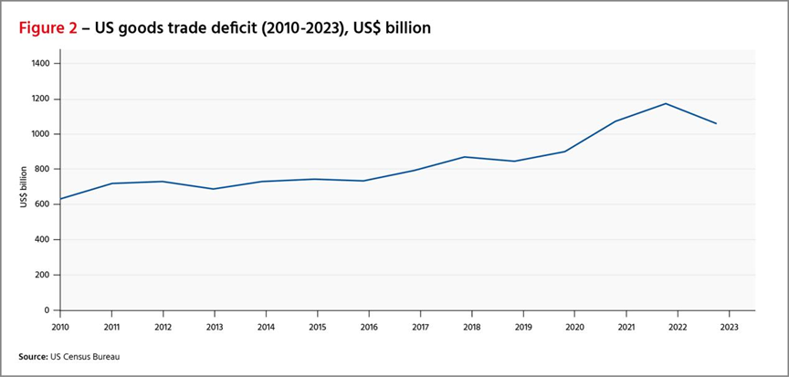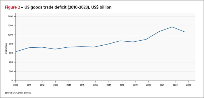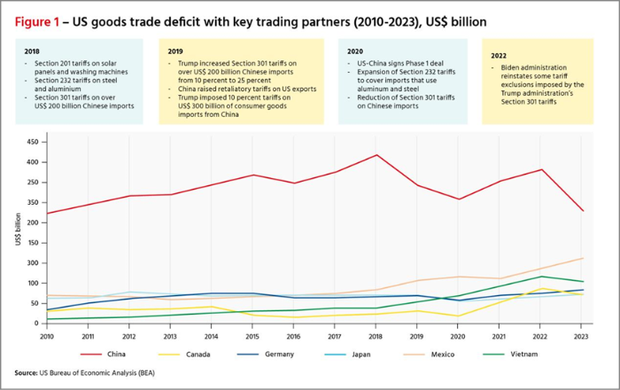 雖然拜登執(zhí)政期間大部分政策調(diào)整都得以實(shí)施,但特朗普的一項(xiàng)關(guān)鍵指標(biāo)被取消了。特朗普將雙邊貿(mào)易逆差的規(guī)模視為衡量美國(guó)是否從貿(mào)易中獲益的標(biāo)準(zhǔn)。與美國(guó)存在大量商品貿(mào)易逆差的國(guó)家被認(rèn)為采用了不恰當(dāng)?shù)馁Q(mào)易做法。