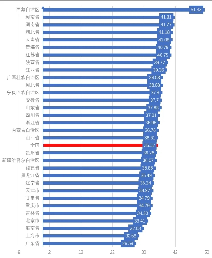 圖1 第七次全國(guó)人口普查:2020年城鎮(zhèn)人均住房建筑面積統(tǒng)計(jì)(單位:平方米)