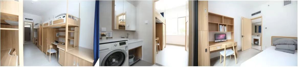 首批疏解高校雄安校區(qū)開展方案設(shè)計(jì)階段正值《指導(dǎo)意見》出臺(tái)。2024年8月陸續(xù)建成宿舍樣板間,雄安校區(qū)宿舍樣板間分為本、碩、博三間。宿舍內(nèi)均設(shè)置居室、衛(wèi)生間、淋浴間、盥洗區(qū)及晾曬區(qū)等功能分區(qū),各功能分區(qū)相互獨(dú)立、干濕分離。本科生宿舍為4人間,上床下桌,配備空調(diào)、洗衣機(jī)、獨(dú)立衛(wèi)浴、晾衣桿等設(shè)施;碩士生宿舍為2人間,上床下桌,空調(diào)、洗衣機(jī)、獨(dú)立衛(wèi)浴等設(shè)施也都非常完備;博士生宿舍為兩居室單人間,房間內(nèi)配備單人床、書桌、衣柜、空調(diào),公共區(qū)域配備獨(dú)立衛(wèi)浴、洗衣機(jī)等設(shè)施。