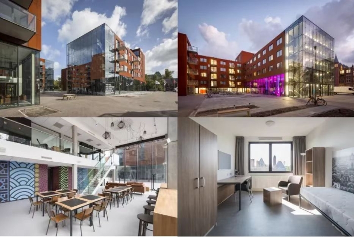 該宿舍位于荷蘭代爾夫特,2017年投入使用。該建筑包含332個(gè)公寓單元,可容納來自全世界的350位學(xué)生同時(shí)居住。除解決學(xué)生居住問題,該項(xiàng)目通過建立學(xué)校與城市的良好連接性,加強(qiáng)了學(xué)生與周圍社區(qū)的緊密聯(lián)系。