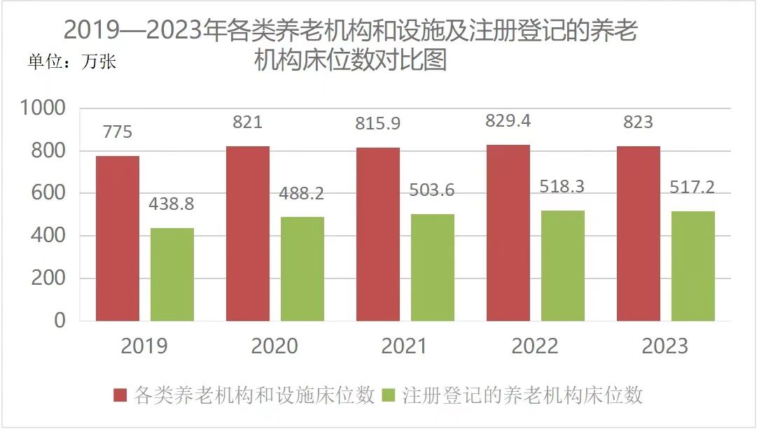 圖2 2019-2023年各類養(yǎng)老機(jī)構(gòu)和設(shè)施及注冊(cè)登記的養(yǎng)老機(jī)構(gòu)床位數(shù)對(duì)比圖