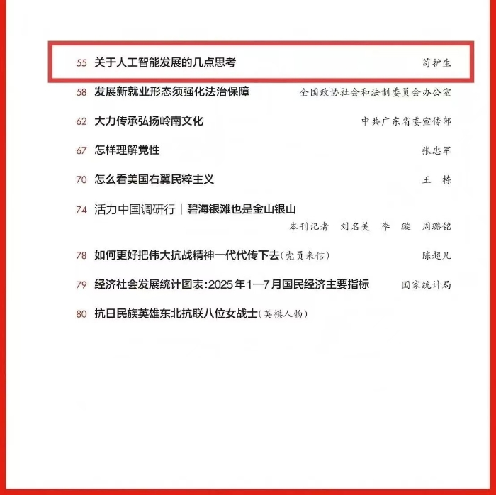 編者按:9月1日出版的2025年第17期《求是》雜志刊發(fā)公司黨委書記、董事長(zhǎng)茍護(hù)生同志理論文章《關(guān)于人工智能發(fā)展的幾點(diǎn)思考》,文章立足全球人工智能發(fā)展浪潮,緊扣我國(guó)人工智能產(chǎn)業(yè)實(shí)際,以辯證思維深入剖析創(chuàng)新與開放、發(fā)展與安全、政府與市場(chǎng)、應(yīng)用與治理的內(nèi)在邏輯關(guān)系,在搶抓人工智能發(fā)展機(jī)遇、直面技術(shù)應(yīng)用風(fēng)險(xiǎn)挑戰(zhàn)中,為推動(dòng)人工智能與經(jīng)濟(jì)社會(huì)深度融合、助力我國(guó)搶占全球科技競(jìng)爭(zhēng)主動(dòng)權(quán)提供了有益借鑒?,F(xiàn)予以轉(zhuǎn)載,供學(xué)習(xí)參考。
