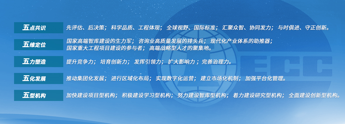 中咨公司牢記初心使命,以習近平新時代中國特色社會主義思想為指導,落實中央加強中國特色新型智庫建設和促進咨詢業(yè)高質量發(fā)展的要求,公司正按照錨定發(fā)展目標、夯實發(fā)展基礎、調整發(fā)展姿態(tài)、突出發(fā)展特點、取得發(fā)展成效的“五五戰(zhàn)略”,立足“五點”認識,強化“五維”定位,聚焦“五力”提升,推動“五化”發(fā)展,建設“五型”機構,全力推進國家高端智庫和世界一流咨詢機構建設。